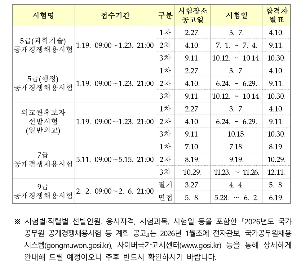 2026년 국가공무원 공개경쟁채용 시험 등 일정 공고 2026년도 5·7 ·9급 국가공무원 공개채용시험 및 외교관후보자 선발시험 일정을 다음과 같이 공고합니다.다만, 시험일정은 시험관리 사정 등에 따라 변경될 수 있으며, 변경될 경우 변경사항은 수정공고를 통해 안내해드릴 예정입니다.